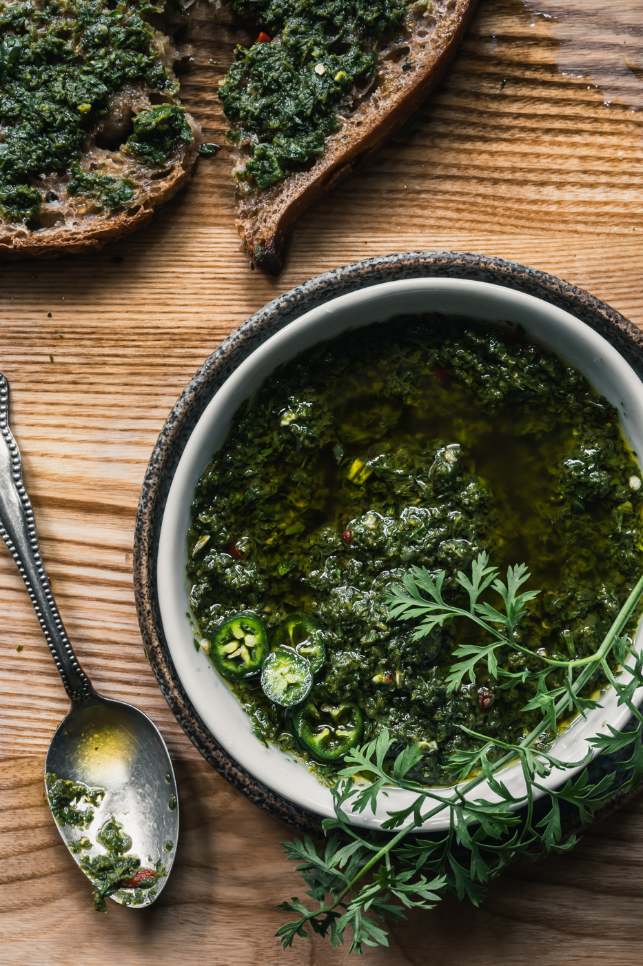 I will take zhoug over pesto any day. The warming spices combined with the heat of the peppers creates the most wonderful spread that never gets old. It’s become a staple in our house, especially ever since I created this Carrot Top Zhoug recipe. It was developed out of a need to utilize the whole plant and not waste any part of the precious carrots we were receiving from our weekly CSA boxes.