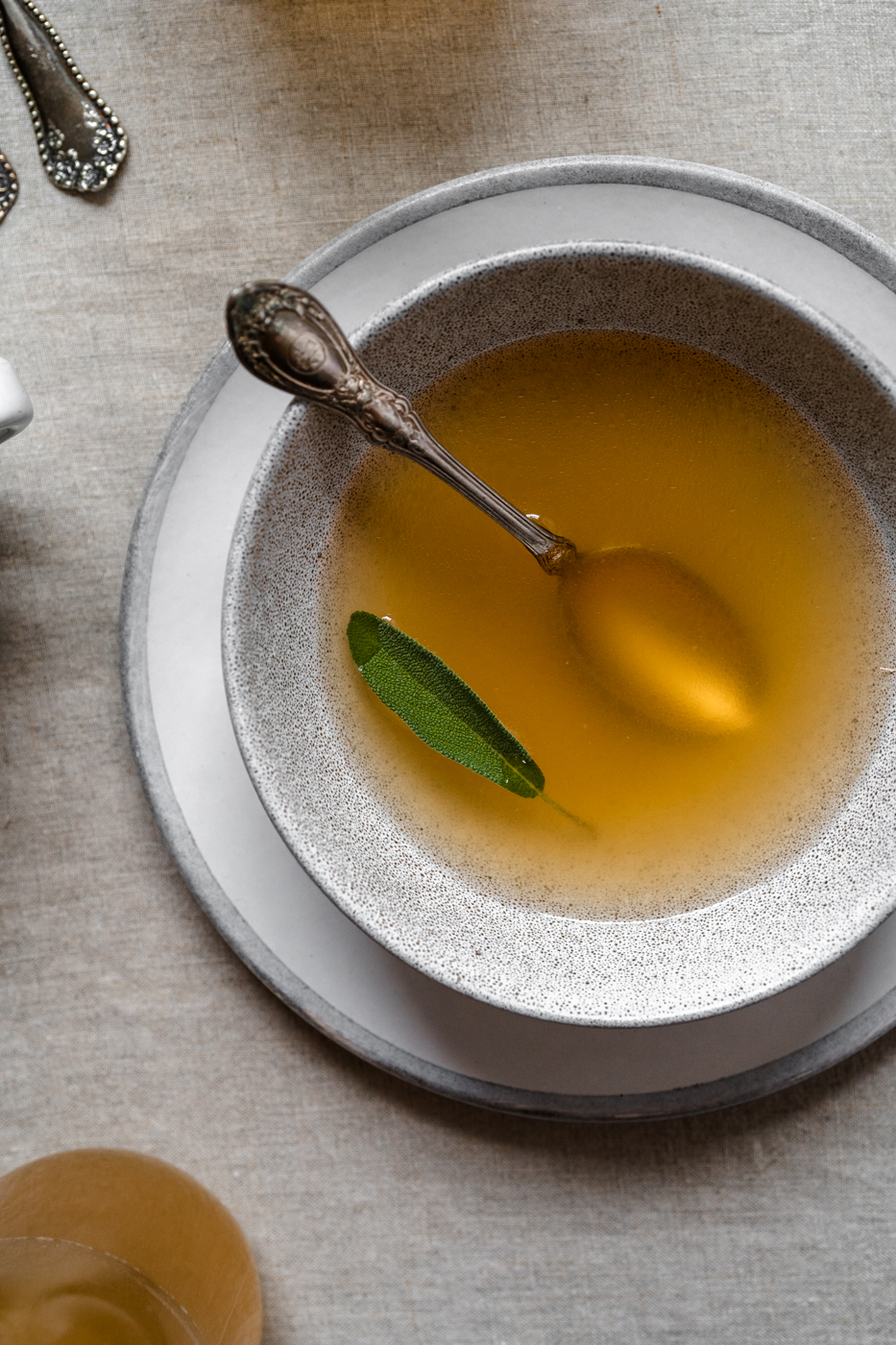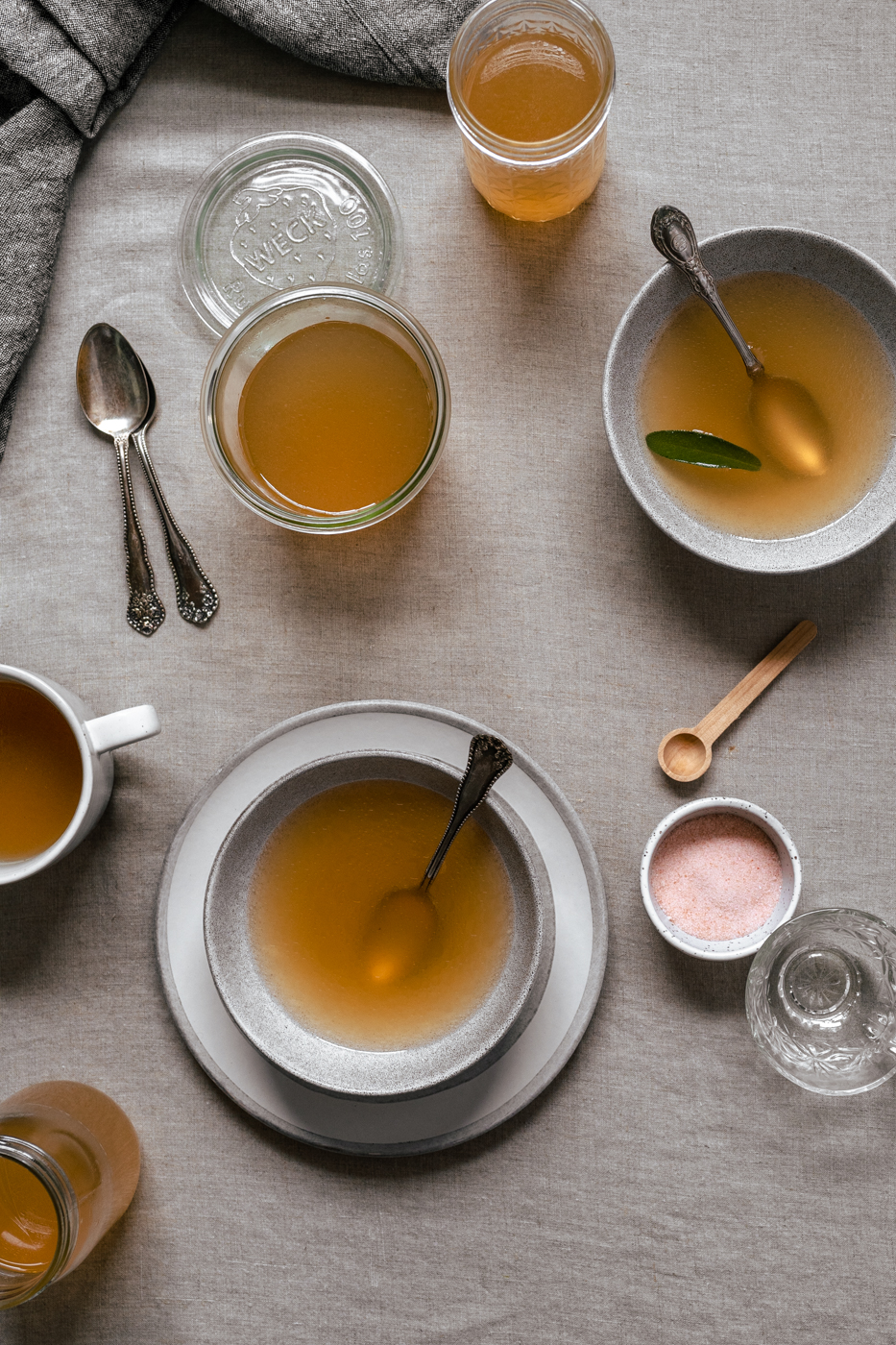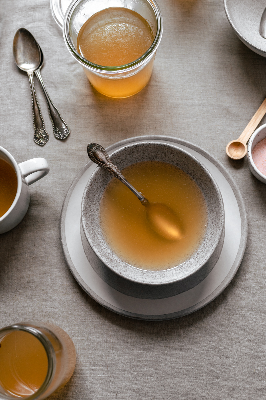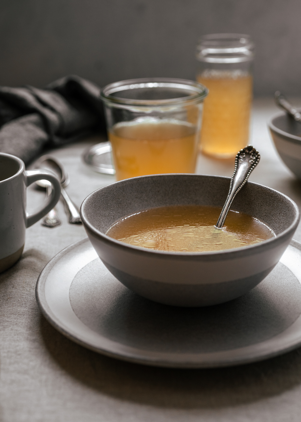 I wish I could give everyone homemade bone broth. It is healing and warming, seriously pure comfort when lightly seasoned with salt and steam is blowing off the top. Bone broth can be enjoyed year-round, but there is something so special about bundling up in the cooler months and warming your hands with a mug of this delicious elixir.